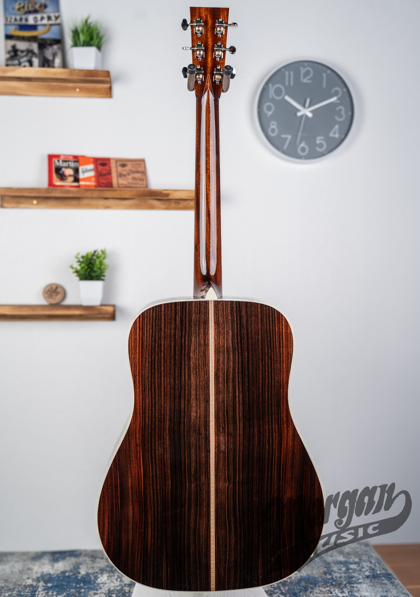 Our 2-style (D2H) features East Indian rosewood back and sides with ivoroid body binding and butt wedge, herringbone top purfling, a “zipper” backstrip, diamonds and squares fingerboard inlays, and a more intricate 2-style rosette.