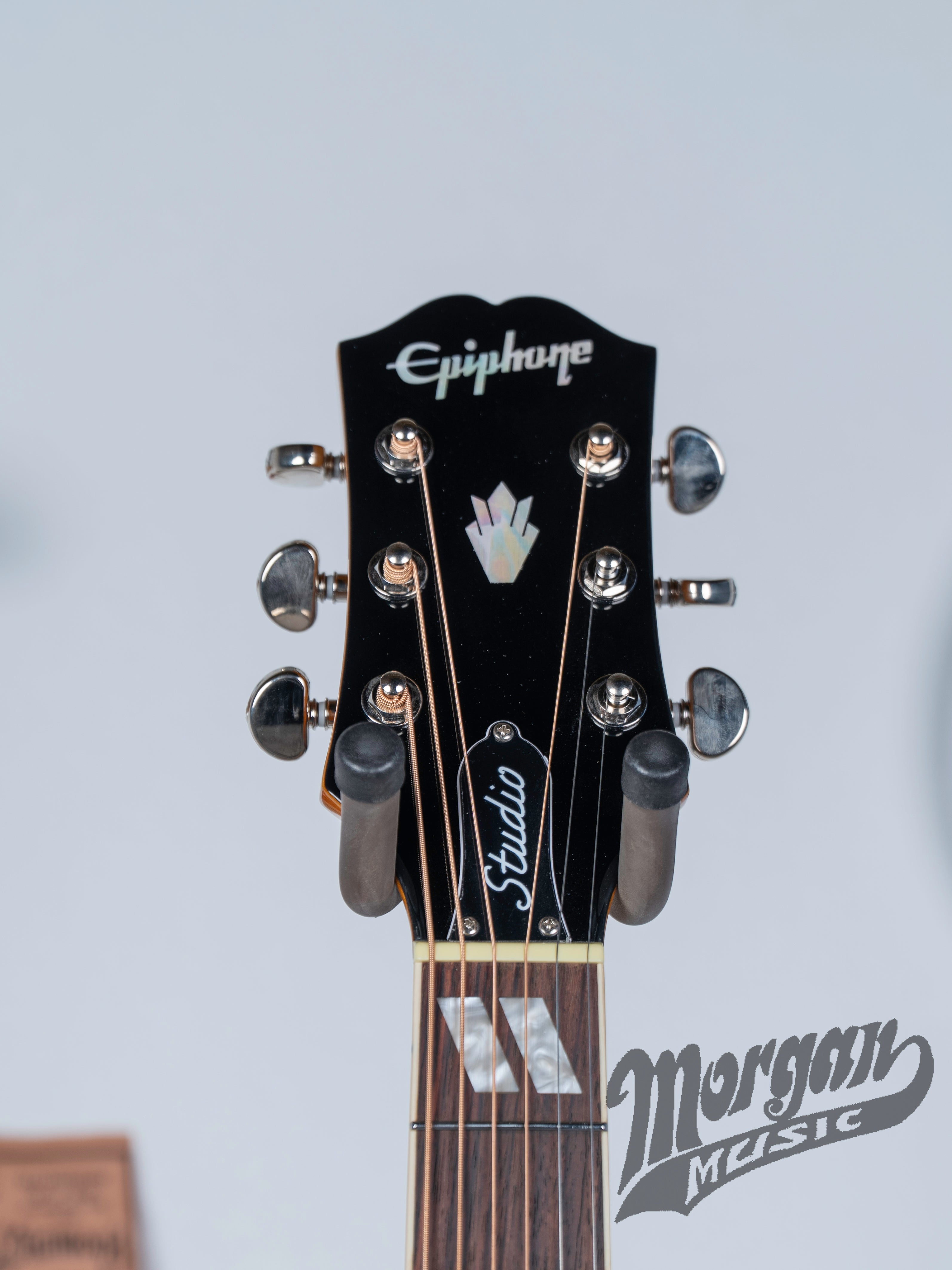 The Dove Studio features a layered maple body with six-ply antique ivory and black binding on the top, four-ply antique ivory and black binding on the back, and a solid spruce top for a responsive, balanced tone with excellent dynamic range. Because it has a solid top, it will sound even better as it ages. The mahogany neck is joined to the body with a glued-in tapered dovetail neck-to-body joint and features a Rounded C profile that ensures easy playability. The neck is capped with a bound rosewood fretboard, equipped with 20 standard frets, and adorned with the classic split parallelogram inlays that are a hallmark of the Dove design. The other ends of the strings pass over a compensated plastic saddle and are anchored to the belly-up rosewood Dove bridge with ivory-colored bridge pins. We also included other details that give the Dove Studio even more vintage-style visual appeal, including the pearloid dove inlays on the bridge, a Dove pickguard with the iconic Dove graphics, high-quality Grover® Rotomatic® tuners for precise and stable tuning, and a 60s Kalamazoo-style headstock with the Epiphone logo and Gibson Crown inlaid in mother of pearl. The Dove Studio comes with Fishman electronics, including an S-Core under-saddle pickup and Fishman™ Presys VT preamp with soundhole-mounted volume and tone controls that are easy for the player to access while remaining virtually invisible to the audience. The Epiphone Dove Studio has a gloss Natural finish.