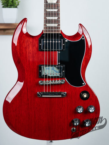 This guitar is in immaculate condition! With no notable wear on it this used SG Standard ‘61 returns to the classic design that made it relevant, played, and loved – shaping sound across generations and genres of music. In 1961, the Les Paul model was put on hiatus, and an all-new design evolved into what is today known as the SG or “solid guitar.” The Gibson SG Standard ‘61 retains the styling of the legendary original models from the early 1960s. It features a solid mahogany body with the classic double-cutaway SG shape, complete with the iconic deeply sculpted body scarfing and double horns that make this model instantly identifiable. The mahogany neck has a fast-playing SlimTaper profile and is capped with a bound rosewood fretboard that is equipped with 22 medium jumbo frets and acrylic trapezoid inlays. The fretboard has a 12” radius, so it’s comfortable for first-position chords, and lead lines played higher up the neck won’t fret out. The neck joins the body at the 22nd fret, ensuring easy access to its entire length, making the SG an ideal guitar for lead players. As with the earliest SG models, the SG Standard ’61 features a 5-ply teardrop-shaped pickguard. The nickel-plated hardware includes a classic-style ABR-1 Tune-O-Matic bridge and aluminum Stop Bar tailpiece that help contribute to the model’s excellent sustain. The SG Standard ’61 is equipped with smooth-turning Vintage Deluxe tuners with Keystone buttons and has a Graph Tech nut. The pair ensure rock-solid tuning stability. The pickups are 60s Burstbucker™ humbuckers for a classic voice with added power and top end. The 2 volume and 2 tone controls feature audio taper potentiometers and are hand-wired with Orange Drop capacitors. The controls are capped with black Top Hat knobs. The SG Standard ’61 delivers the legendary SG tone, outstanding playability, and American-made Gibson quality that have made the SG the choice of countless players around the world for decades. A Gibson hardshell case is also included.